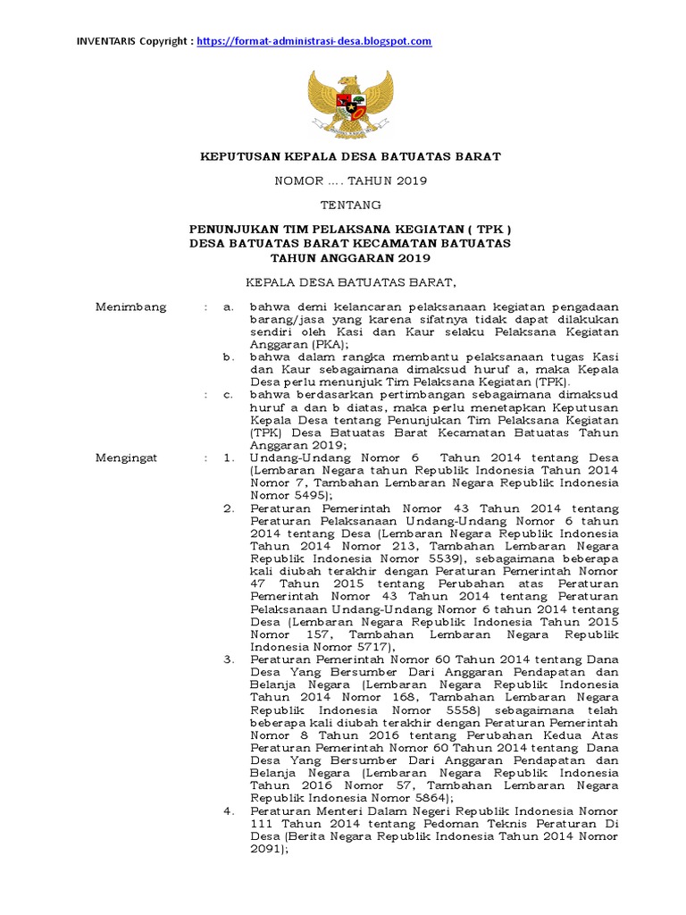 Sk tpk desa adalah salah satu sk kepala desa dalam rangka mengangkat/membentuk/menunjuk beberapa orang dari unsur perangkat desa dan/atau unsur lembaga kemasyarakatan desa untuk membantu kepala desa melaksanakan. Pemerintah kabupaten kutai kartanegara kecamatan tenggarong seberang desa bhuana jaya alamat : Registrácia ivanská 5 a polka. Segala biaya yang melibatkan pelaksanaan keputusan ini akan dibebankan kepada anggaran yang sesuai. Penunjukan tim pelaksana kegiatan desa.