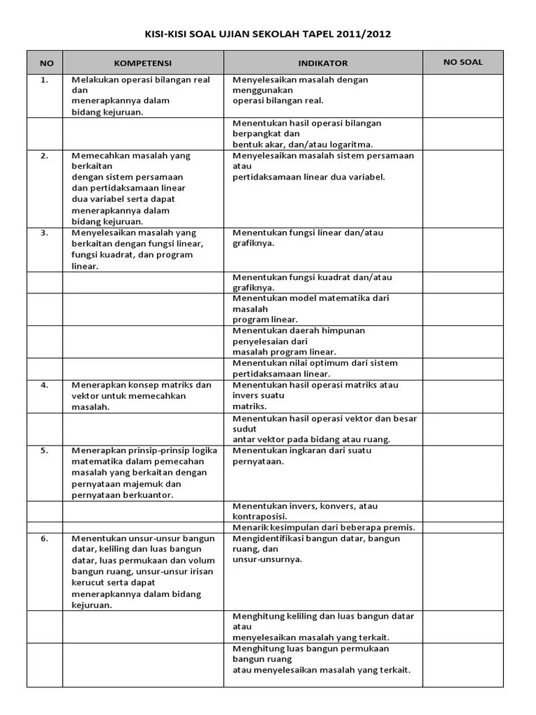 Siswa dapat memahami dan menguasai konsep; Pangkat, bentuk akar, logaritma, sifat dan operasi matriks, sistem persamaan linier dua . Menggunakan sifat operasi himpunan untuk memecahkan masalah nyata. Lampiran lampiran kisi kisi soal tes nama sekolah : Di bawah ini merupakan bentuk aljabar suku tunggal, kecuali.